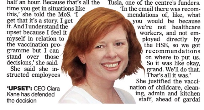 ‘Ultimately, I stand over the decision that I had to make in about half an hour. Because that’s all the time you get in situations like this,’ she told the MoS. ‘I get that it’s a story. I get it. And I understand the upset because I feel it myself in relation to the vaccination programme but I can stand over those decisions,’ she said. She said she instructed employees to represent themselves as category 2(e) frontline healthcare workers after getting an email from Tusla, one of the centre’s funders.