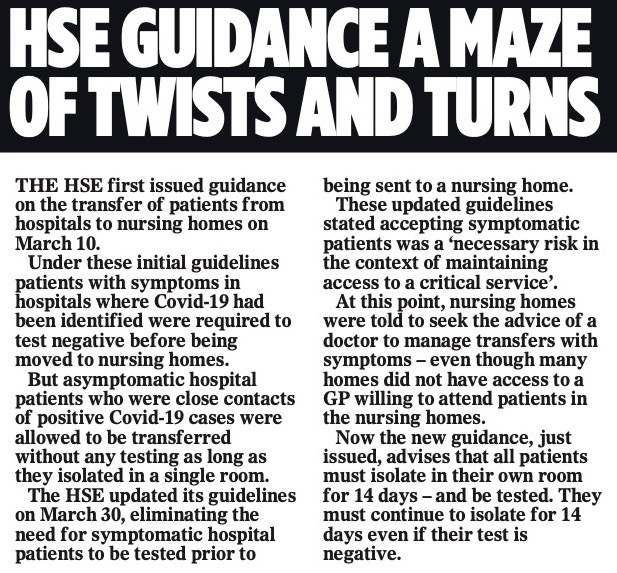 HSE guidance on the testing of transfers from hospitals was first introduced on March 10 and updated on March 30.