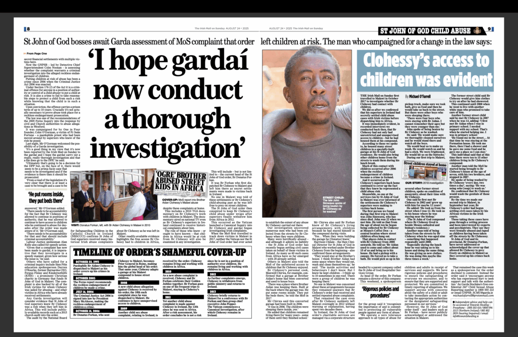 The calls for Garda intervention follow a near-decade long investigation by this newspaper into how the St John of God religious order covered up the Irish crimes of serial paedophile, Br Aidan Clohessy, allowing him to abuse freely in Africa.