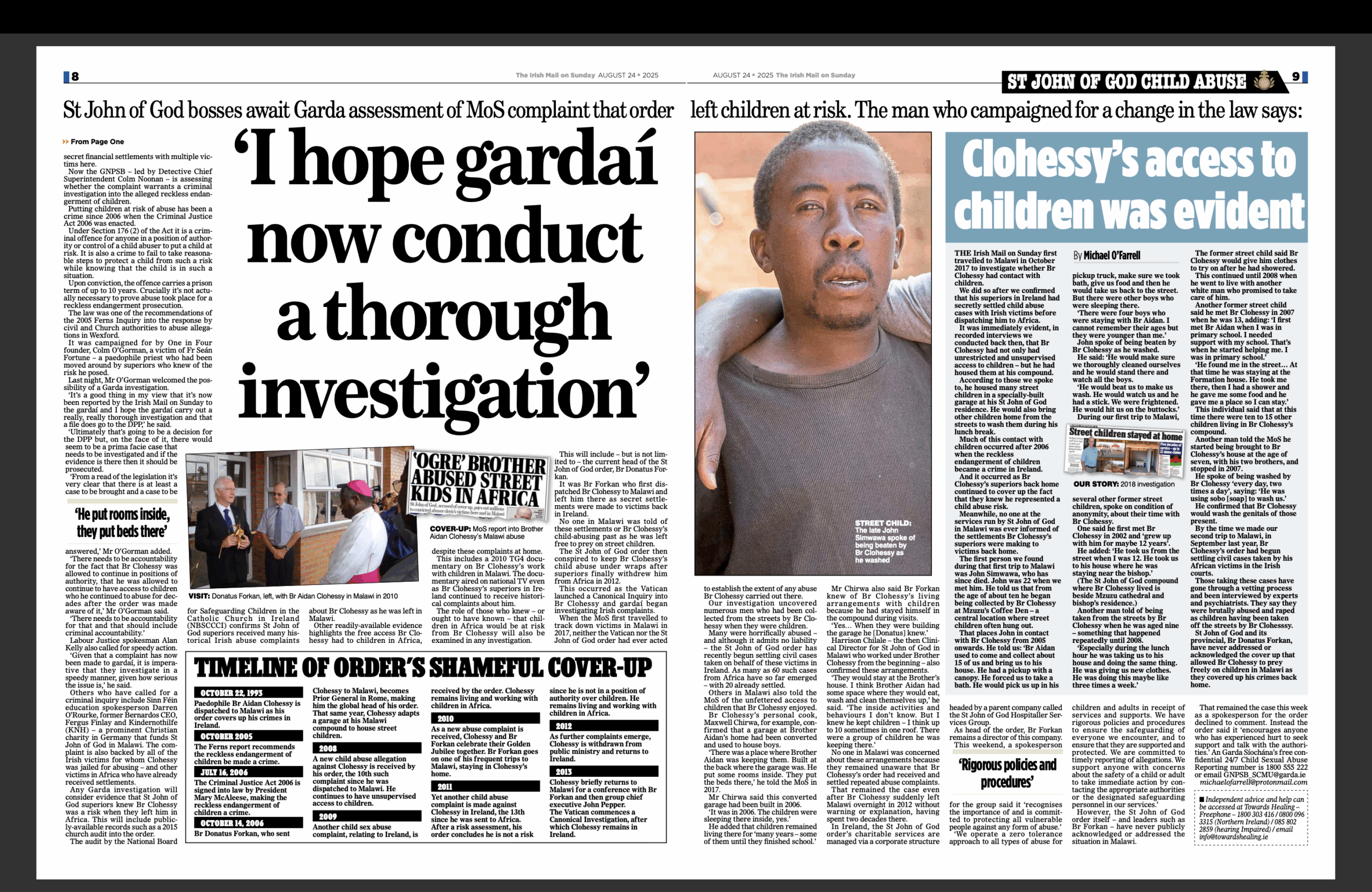THE Irish Mail on Sunday first travelled to Malawi in October 2017 to investigate whether Br Clohessy had contact with children.